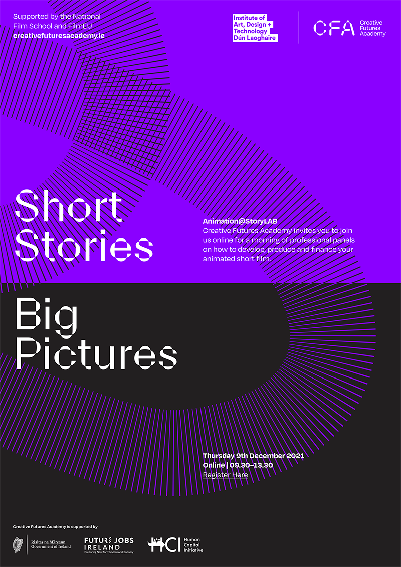 IADT are holding a free workshop on December 9th. Animation@Storylab is a workshop that will bring together Directors, Producers and Funders to discuss the landscape for short animated film making in Ireland. It is free to attend, and runs from 9:30am - 1:30pm (WET) and will be an online event.